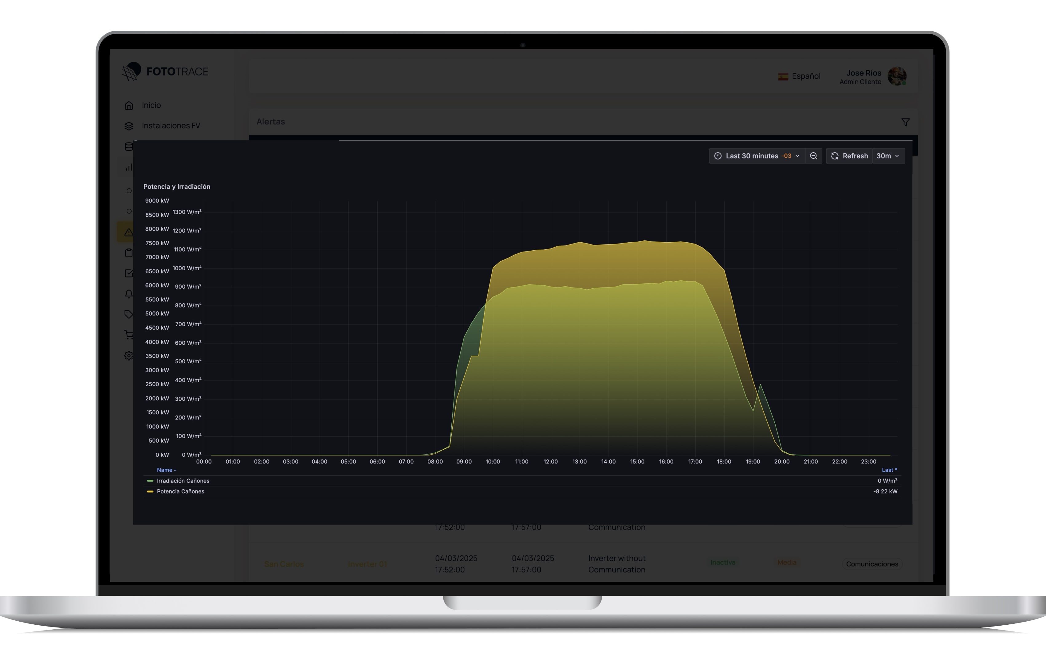 Posibilidad de integrar los datos de producción y rendimiento de tus plantas fotovoltaicas directamente en la plataforma. Esto automatiza la recopilación de información clave, facilita el análisis y permite detectar incidencias sobre las que activar actuaciones.